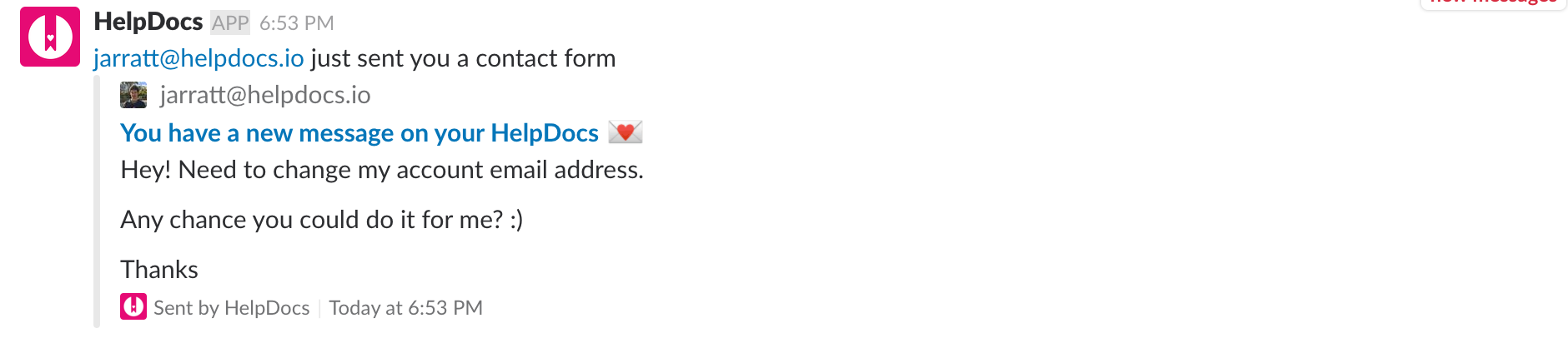 If you're using HelpDocs without live chat, you'll automatically get a smart contact form to filter and receive customer queries. You can receive these straight into your Slack channel, giving everyone the ability to reply and view what customers are saying. Here's what we show: