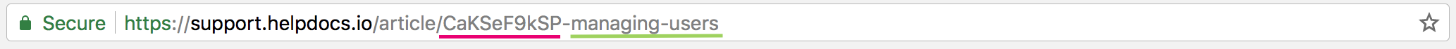 In the example below, the pink part is automatically generated to prevent URL conflicts (you can turn this off but we don't recommend it). The green part is the slug that you can customize.